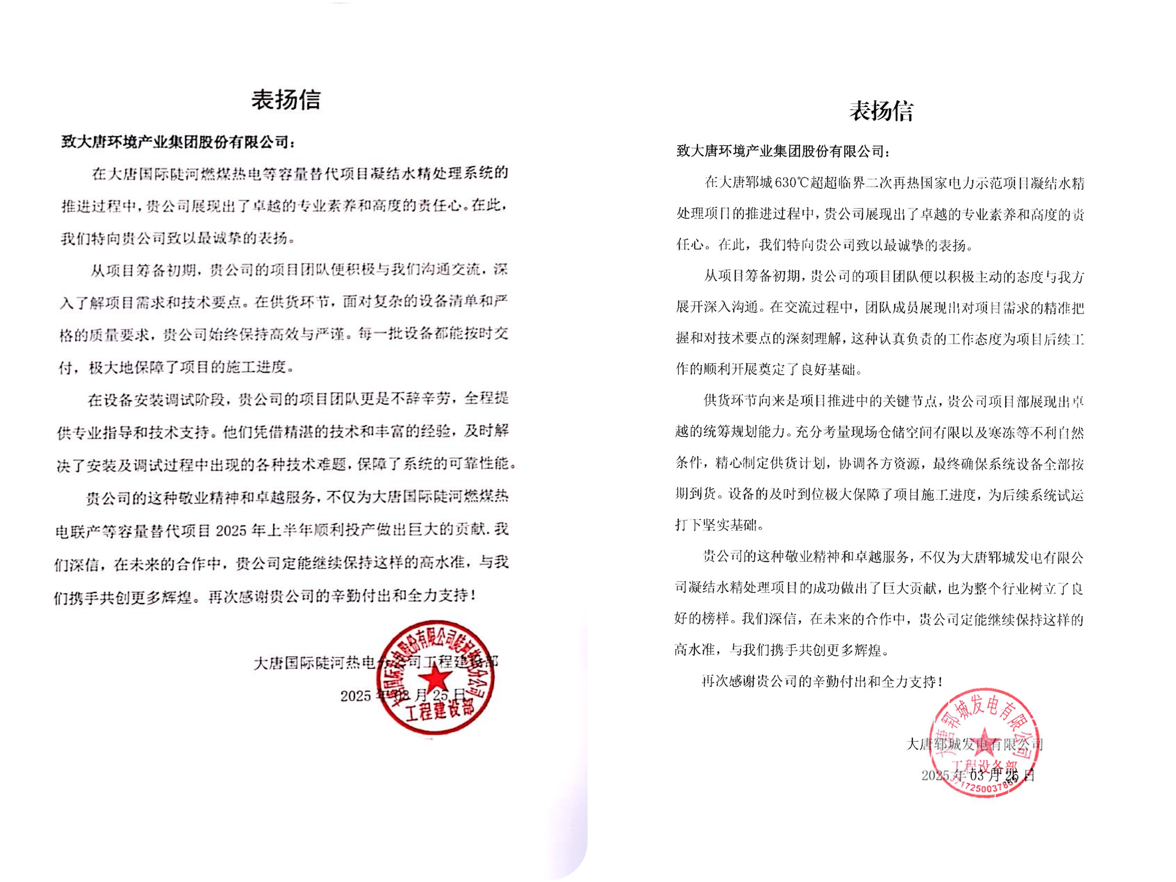 本网讯 近日,水处理事业部凭借在陡河项目与郓城项目中的卓越表现,接连收到两封业主发来的表扬信。信中对我方团队展现出的专业实力、服务精神及执行效率给予高度评价。